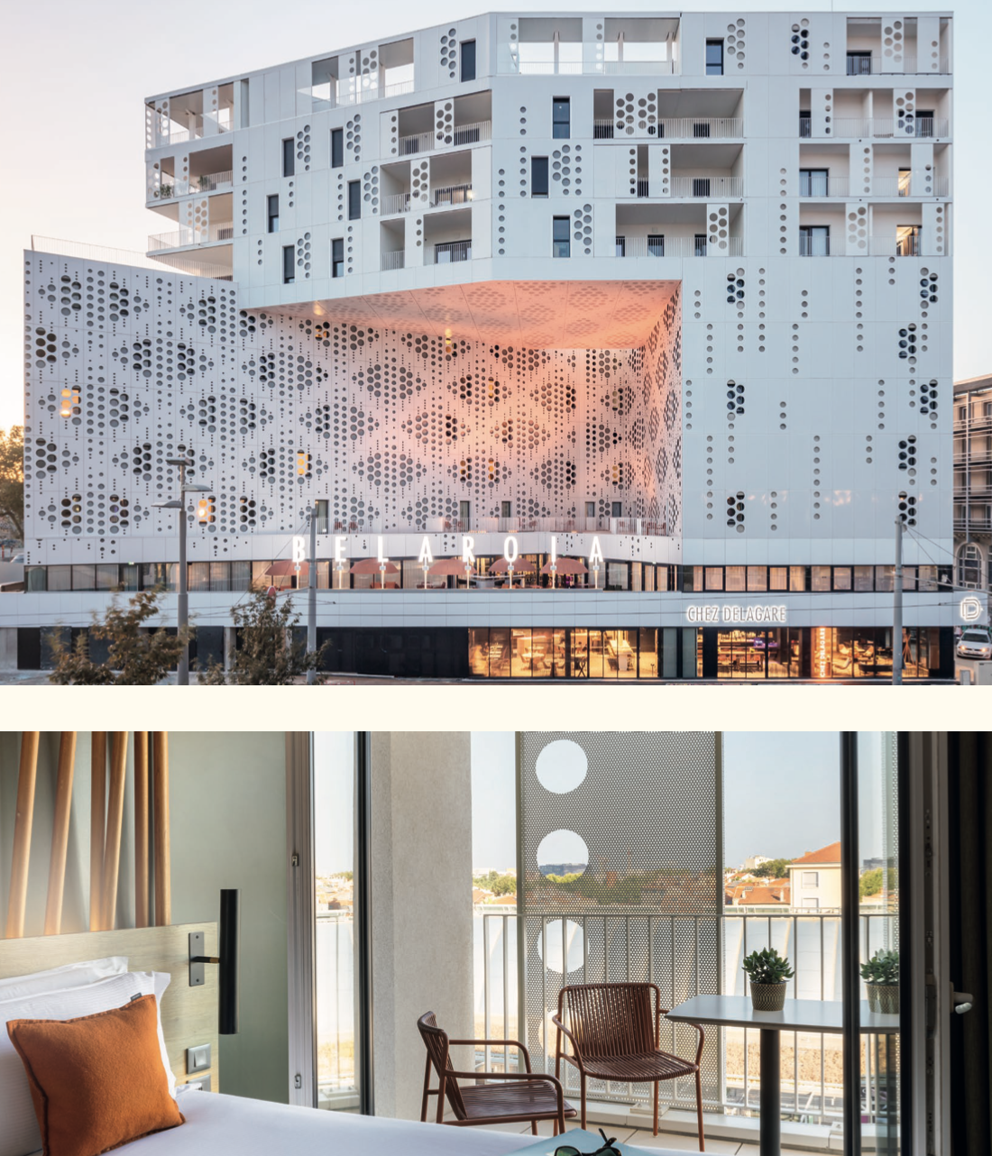 Le Belaroïa s’érige en véritable repère visuel grâce à sa spirale blanche et ajourée qui s’ouvre sur la ville. Conçue par l’architecte montpelliéraine Manuelle Gautrand, l’architecture de l’hôtel invite à la rencontre entre voyageurs et locaux. Le bâtiment est une œuvre audacieuse qui reflète l’essence méditerranéenne de Montpellier et renforce son ancrage urbain.