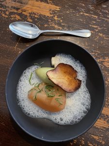 • Poire pochée miel et citron, sublimée par une émulsion lactée et un sorbet à la mélisse.