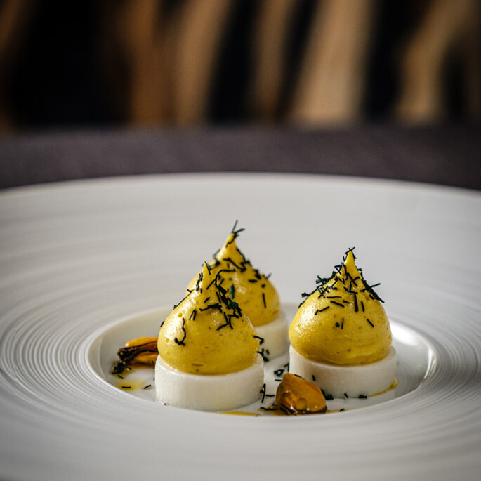 Un art de l’hospitalité prolongé avec minutie. Pour que la qualité des assiettes pleines de goût et de saveurs soit intacte. Un savoir-faire et un don précieux indispensables à la cuisine étoilée du Chef. Julien Medard révèle ici toute son excellence !