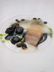 « Ce plat, c’est un voyage entre terre et mer, entre la Norvège et la France », confie Fabien Tavares. « J’ai voulu sublimer le lieu noir sans le dénaturer, en jouant sur les textures, la fraîcheur et la gourmandise. »