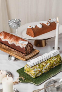La Chocolat, plus classique dans son identité, revisite la bûche roulée avec la générosité attendue des fêtes.