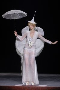 « Je ne fais pas vraiment de la mode, je crée des personnages », affirme Julien Fournié. Et cela s’est vu dès l’apparition de la déesse en trench cyborg, ouvrant un show qui oscille entre futurisme et nostalgie enfantine. Inspiré par les films d’animation, les super-héros et la musique des années 1990, Fournié compose une galerie de figures iconiques : un lapin blanc dealer de luxe, un Monsieur Loyal imposant, un Joker explosé ou encore une clown tout droit sortie d’un film en noir et blanc. Des références assumées qui font de cette collection une véritable plongée dans l’imaginaire du créateur.
