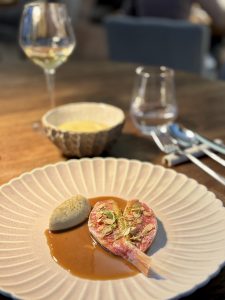 Le rouget de roche au vinaigre de fleur de sureau, soutenu par un jus d’arêtes réduit à l’essentiel, étonne par sa précision. Rien n’est laissé au hasard : la cuisson à plat préserve la texture du poisson, le vinaigre floral ajoute la tension juste.