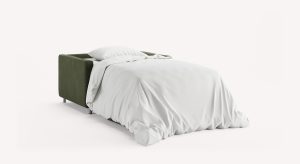 Un fauteuil compact qui se transforme en canapé-lit une place, signé La Maison Convertible, habillé de tissu vert Teatro forest.