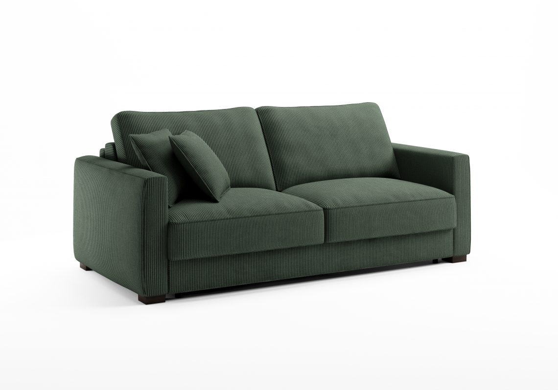 Le canapé-lit Echo, en tissu Fluff 62 Grass, séduit par son allure urbaine et sa sobriété.