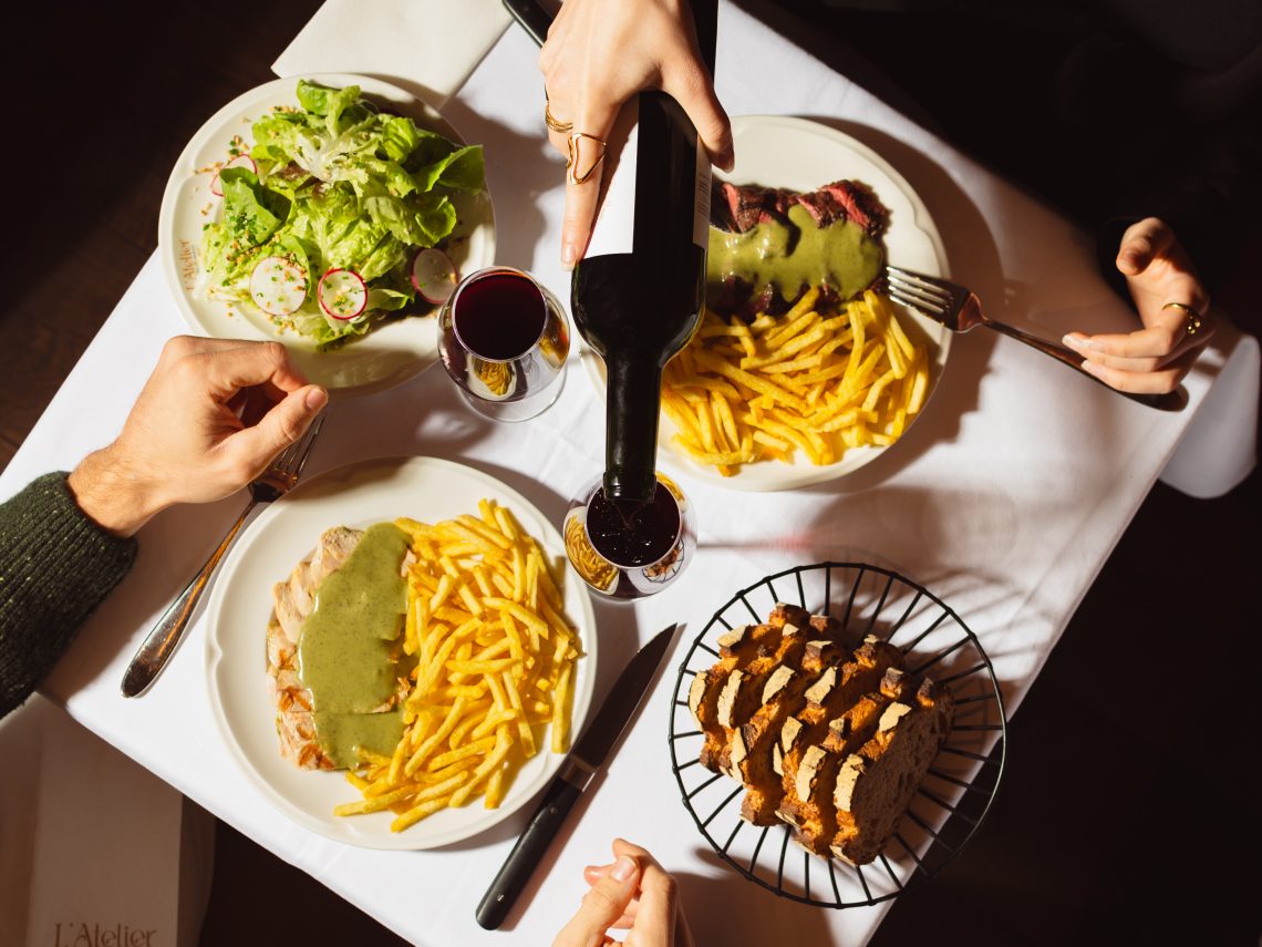 À l’heure du déjeuner, pour moins de 20 euros, savourez une assiette copieusement garnie de bœuf français ou de poulet fermier Label Rouge, accompagné de frites fraîches croustillantes à souhait. Le tout est sublimé par leur sauce emblématique, fruit de plusieurs mois de recherche pour atteindre une harmonie parfaite des saveurs. Pour les plus carnivores, retrouvez la formule signature en deux services de viande pour 27,50 euros. Et pour conclure sur une touche sucrée, une farandole de desserts ravira les palais des plus gourmands. Parmi les incontournables : les crêpes Suzette flambées au Grand Marnier, ou encore les délicieuses profiteroles au craquelin nappées de chocolat chaud.