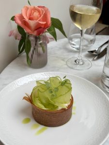 Le repas se prolonge avec une sélection de fromages signée Xavier Thuret, MOF, avant de conclure sur une note sucrée. Le dessert à base de pomme Granny et kiwi, présenté dans un panier croustillant, relevé d’un siphon à la vanille Bourbon et d’une touche d’estragon, apporte fraîcheur et légèreté.