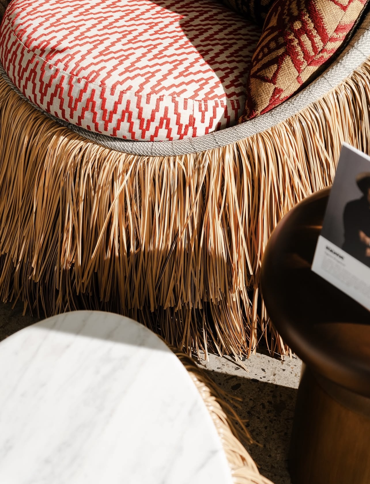 Cinq signatures majeures d’Asie du Sud-Est se sont prêtées au jeu : Eggarat Wongcharit (Thaïlande), Keat Ong (Singapour), Lai Siew Hong (Malaisie), Kezia Karin (Indonésie) et Ivy Almario (Philippines). Chacun a posé son empreinte, entre mémoire et modernité, pour donner vie à des pièces singulières. Chaume nipa, textile tinalak, cordes tressées, bois sculpté ou détails inspirés de la joaillerie indonésienne… Les matériaux racontent des histoires, celles des mains qui les façonnent et des cultures qui les portent.