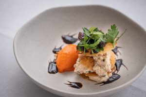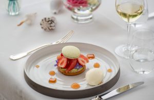 Yoann Noël : Nous avons la chance d’avoir des produits d’une extrême fraîcheur, sortant directement de l’eau juste devant le restaurant. J’aime particulièrement travailler sur des assemblages terre et mer. En Bretagne, nous avons aussi de très bonnes viandes, notamment le cochon, qui se marie parfaitement avec nos recettes. Nous retravaillons également des recettes familiales, comme celle de l’arrière-grand-mère de ma femme, Augustine, avec un ragoût de homard que l’on mange avec les doigts, un clin d’œil aux traditions anciennes.