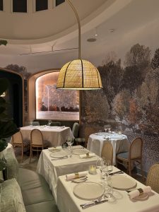 Au cœur du 17e arrondissement, à quelques pas de l’Arc de Triomphe, nous avons poussé les portes de l’hôtel Miss Fuller, joyau de la Drawing Hôtel Collection, pour découvrir son restaurant Serpentine. Dès l’entrée, l’atmosphère nous enveloppe : un bar élégant nous accueille avant de nous conduire à la salle principale, sous la coupole Art Déco, baignée de lumière et décorée par les œuvres de Raphaëlle Peria, représentant les quatre saisons.