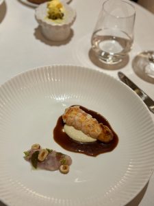 La Langoustine : subtile et délicate, avec une crème à l’amande fumée et un tartare relevé de prune et bergamote. Chaque bouchée fait danser les saveurs en bouche.