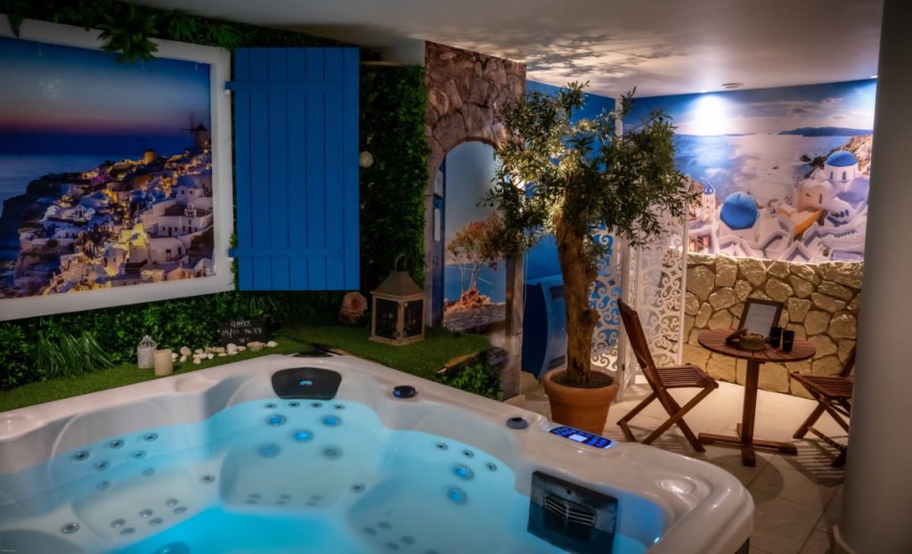 - Ambiance VOYAGE EN GRÈCE : Pour une ambiance romantique et ressourçante, direction Santorin ! Les maisons blanches et toits bleus typiques de cette île grecque vous accueillent pour une évasion en Méditerranée. Dans ce décor apaisant, profitez d’un jacuzzi balnéo et laissez-vous aller à la détente sous un olivier grandeur nature.