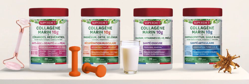 De ce fait, SuperDiet propose une approche experte avec quatre nouvelles formules à base de collagène marin, complétées par des actifs marins, végétaux, vitaminiques et minéraux. Chacune des références apporte 10 g de collagène marin par dose journalière pour une efficacité optimale.
